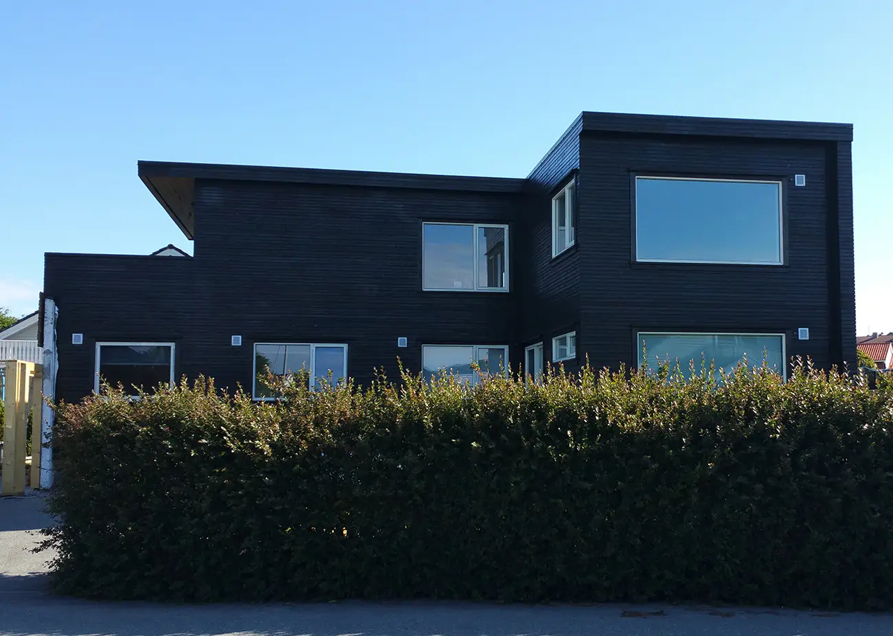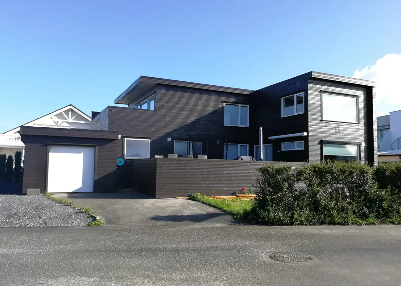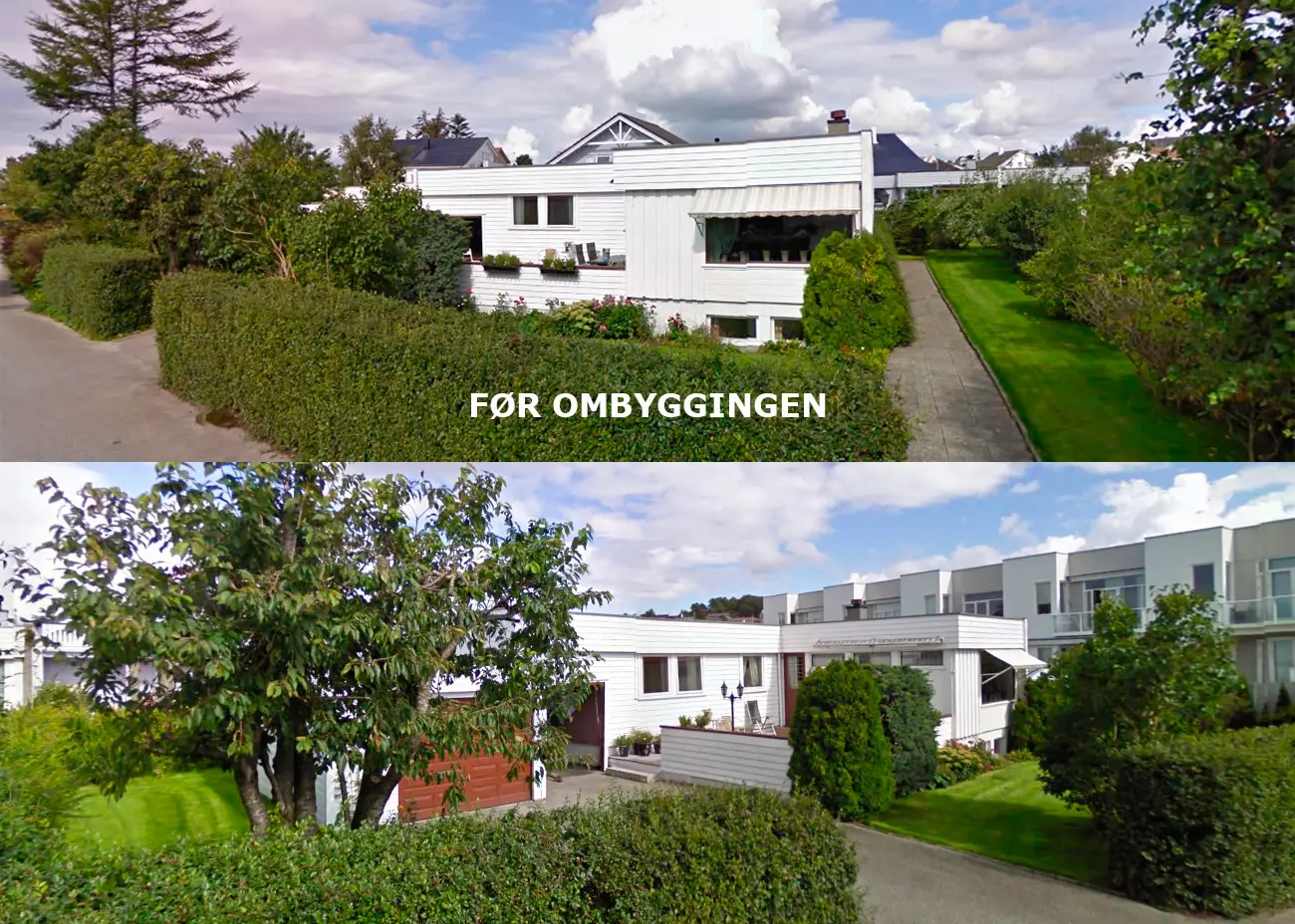 Boligen var opprinnelig oppført med en hovedetasje, en kjelleretasje, en carport og en garasje. Det flate taket ble revet og det ble bygget en helt ny 2.etasje med tre nye soverom, et nytt bad og en ny stue. Den eldre carporten ble bygget om til et soverom og en bod i 1.etasje og med en takterrasse, som er tilgjengelig fra den nye store stuen i 2.etasje. Nye vinduer, dører og kledning gjør at hele huset fremstår som en ny moderne bolig.